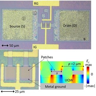 Charge-sensitive infrared phototransistors (CSIP) constitute an outstanding technology for mid-infrared detection with sensitivities demonstrated at the single photon level. Here, we report on the performances of CSIP detectors operating at a wavelength λ = 8.9 μm that are integrated into double-metal patch antenna resonators. In order to build such devices, we have developed a fabrication protocol that allows accommodating the phototransistor architecture with the double-metal geometry providing very strong electromagnetic field confinement. We observe minimal photon fluxes in the order of 7000 photons/s.μm^2 that are 10^3 smaller with respect to previous realizations of devices with similar absorbing regions in a mesa geometry. This work opens additional perspectives for building ultra-small area devices, as required for single photon counters, while keeping high quantum absorption efficiencies.